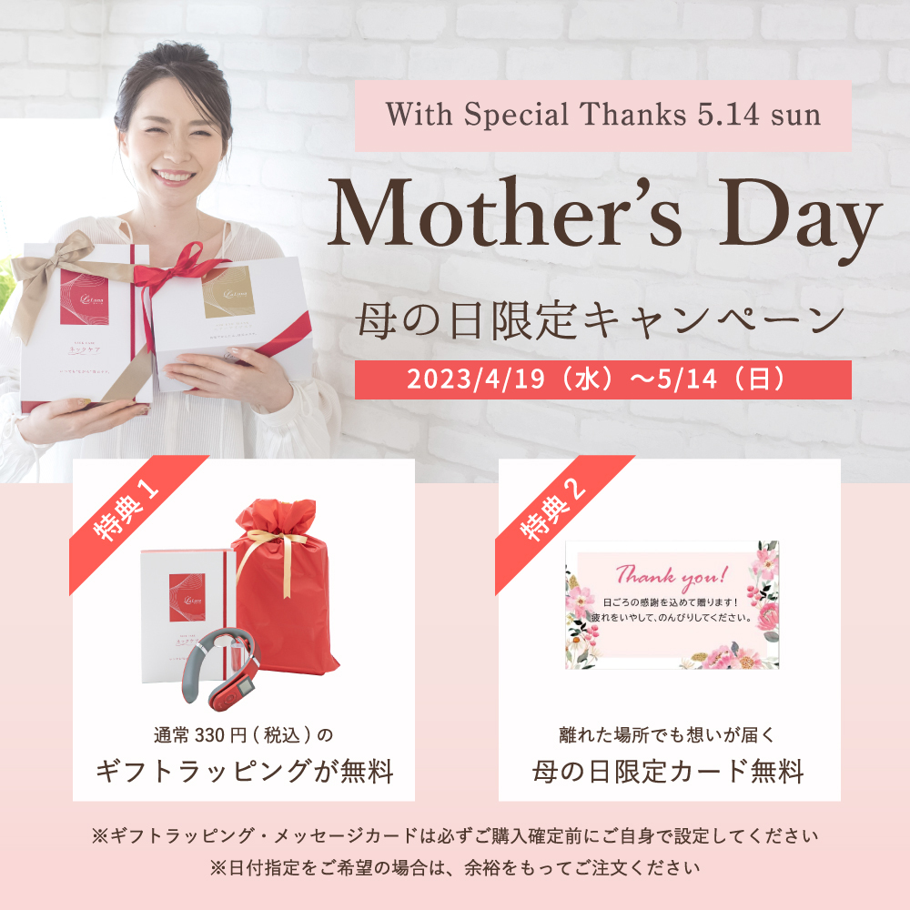 ・期間中に「公式オンラインストア」にてエアーアイマスク本体・ネックケア本体・筋膜リリースガンをご購入いただいた方。 ・商品をカートへ入れる前に【母の日メッセージカード】を指定していただいた方。 ▼ラッピングに関して